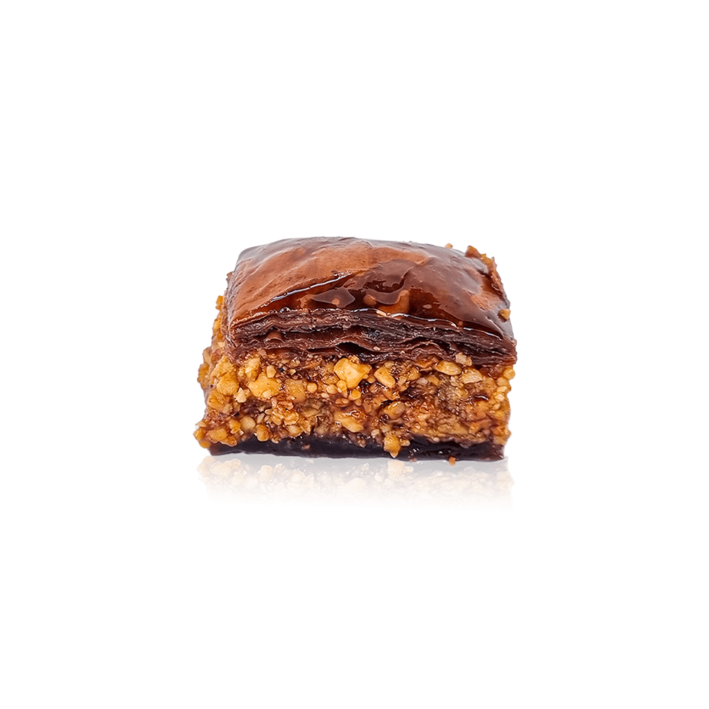 Aluat de baklava ușor însiropat și crocant, cu alune de pădure, cafea și cardamom, aromat cu esență de flori de portocal și trandafiri.